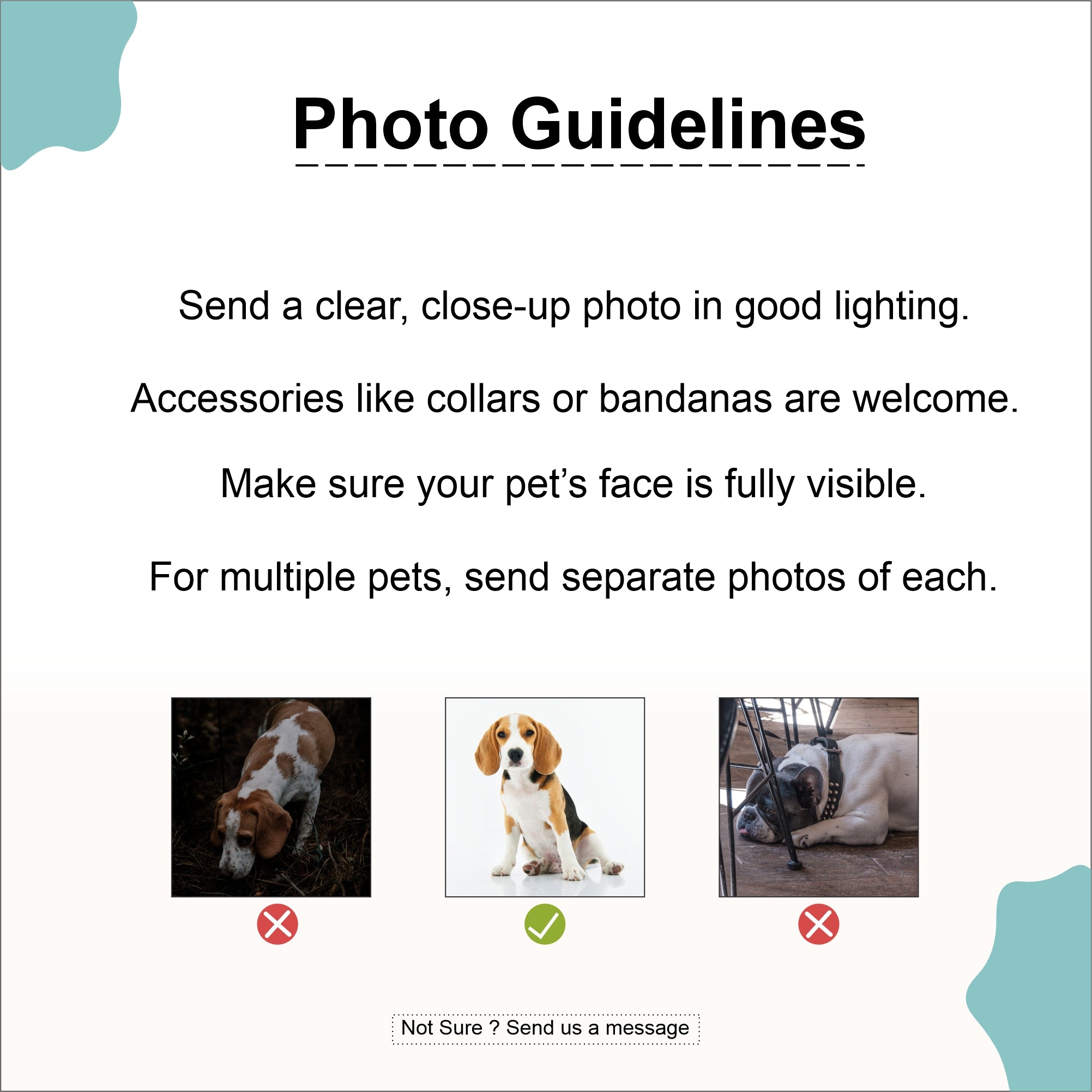 We check all pet photos we receive. Usually the photo is perfectly fine. If there's a problem we'll email you and explain the issue, and request some new photos via email.