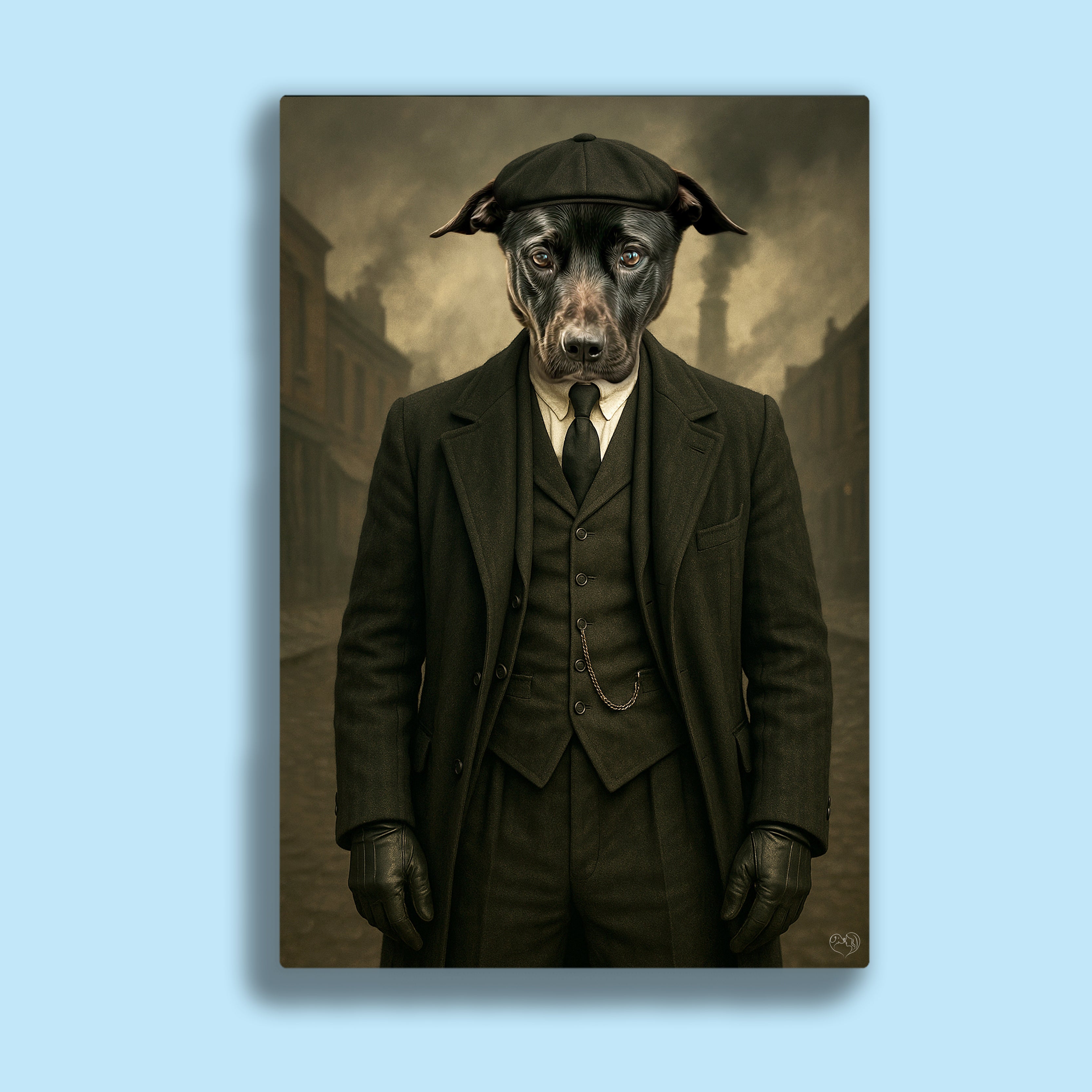 Transform your pet into Arthur Shelby from Peaky Blinders with this custom portrait. Grit, loyalty, and vintage gangster style — tailored by real UK artists.